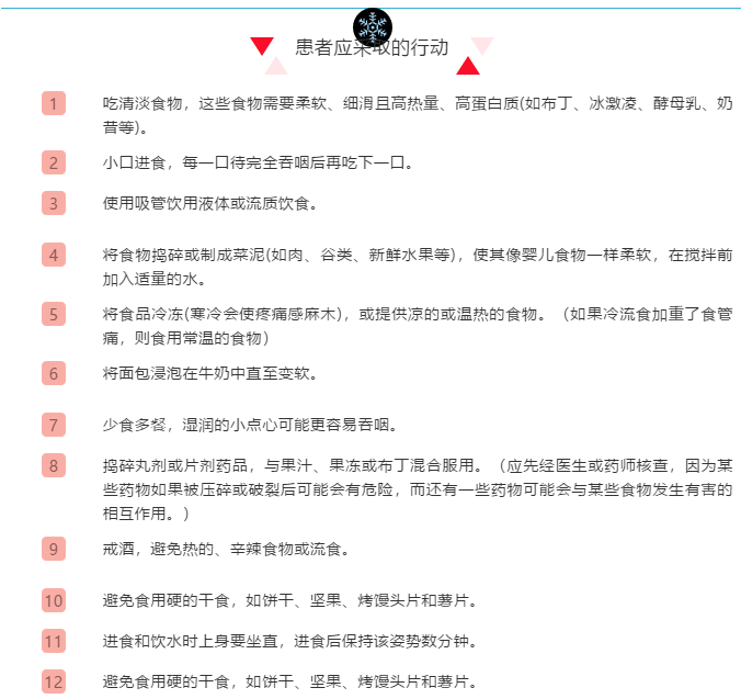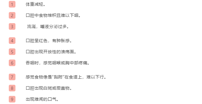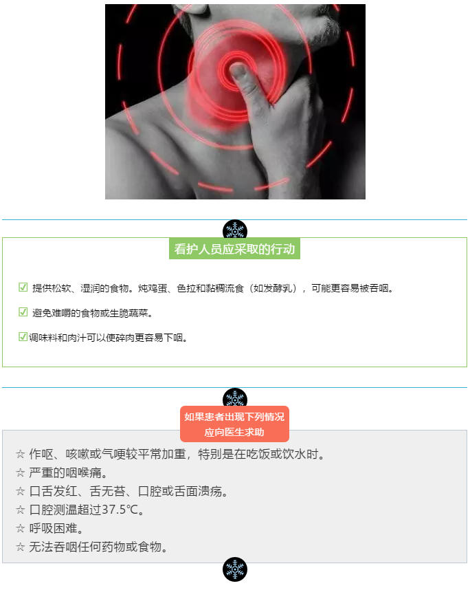 吞咽困难是指患者无法将食物或水通过咽喉下送。当努力吞咽时,患者可能会出现呕吐、咳嗽、流涎或明显疼痛感。导致吞咽困难的病因有多种,除针对咽喉或胸部放疗和化疗所产生的短期不良反应外,口腔感染(如鹅口疮)或食道感染也是常见病因。